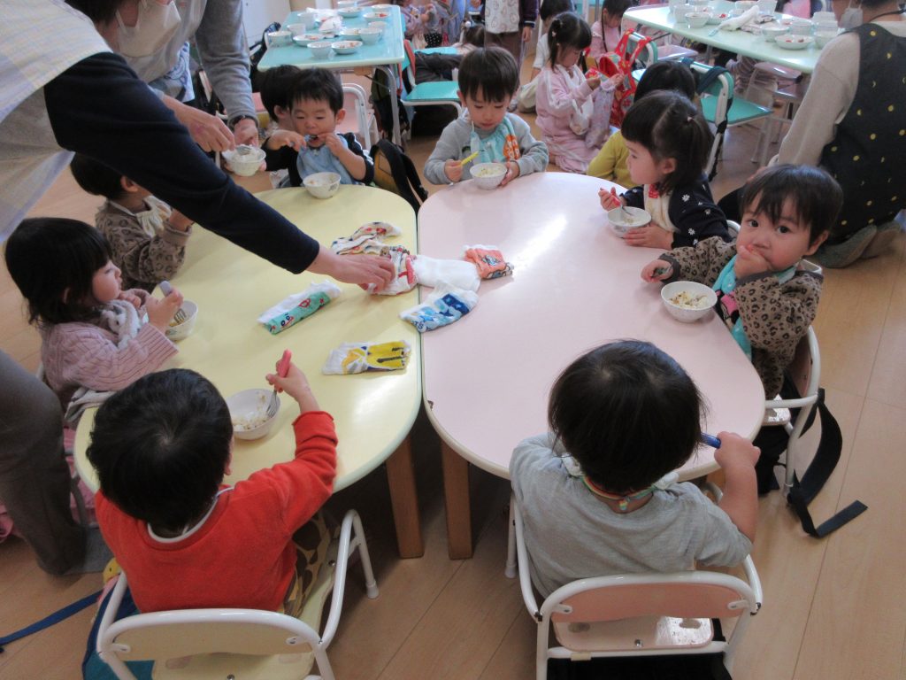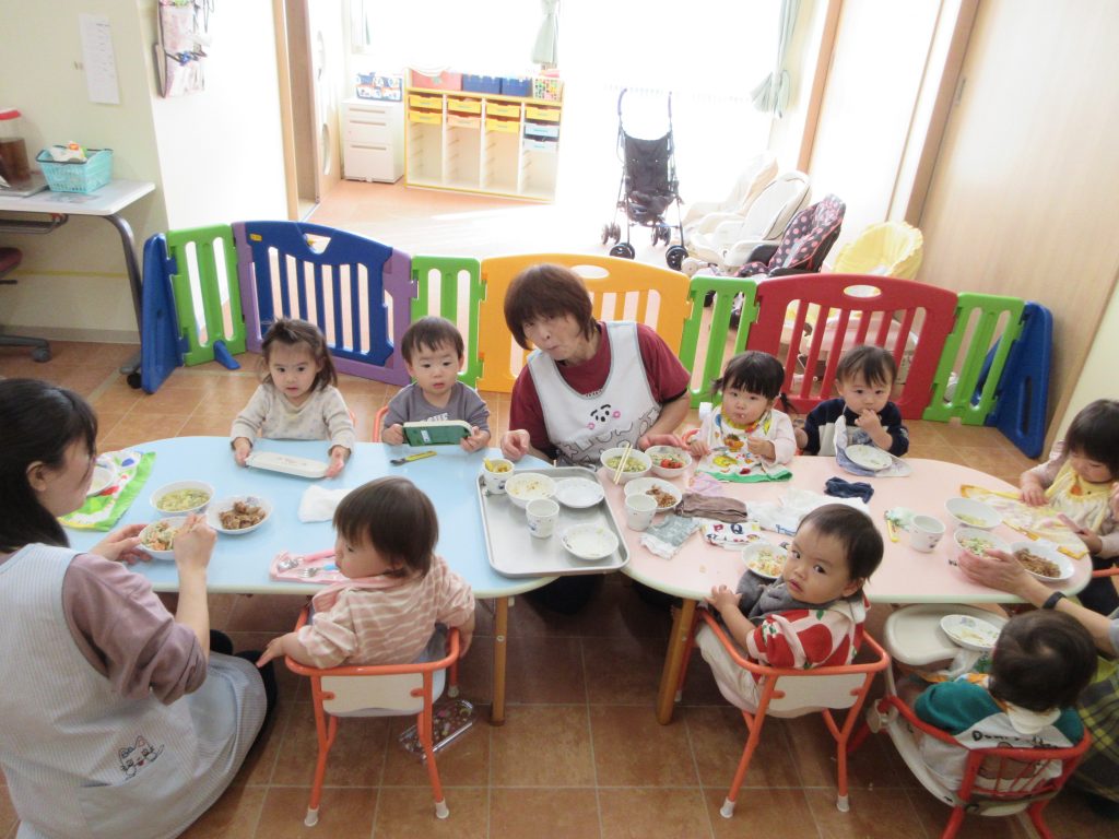 ひよこ組:昼食中「給食、おいしいね~(^^)/」 りす1歳児昼食タイム🥄上手にスプーンで食べてます🥄