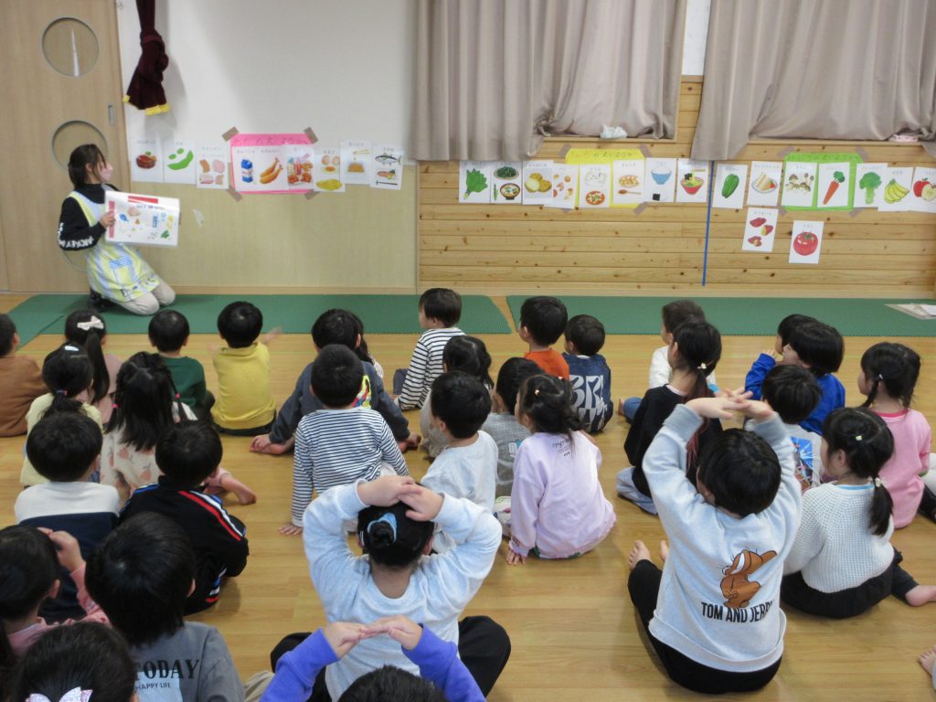 健康講座「3つの栄養ってなに?」食材に興味を持ってもらい、好き嫌いなく食べる事を、約束しました。