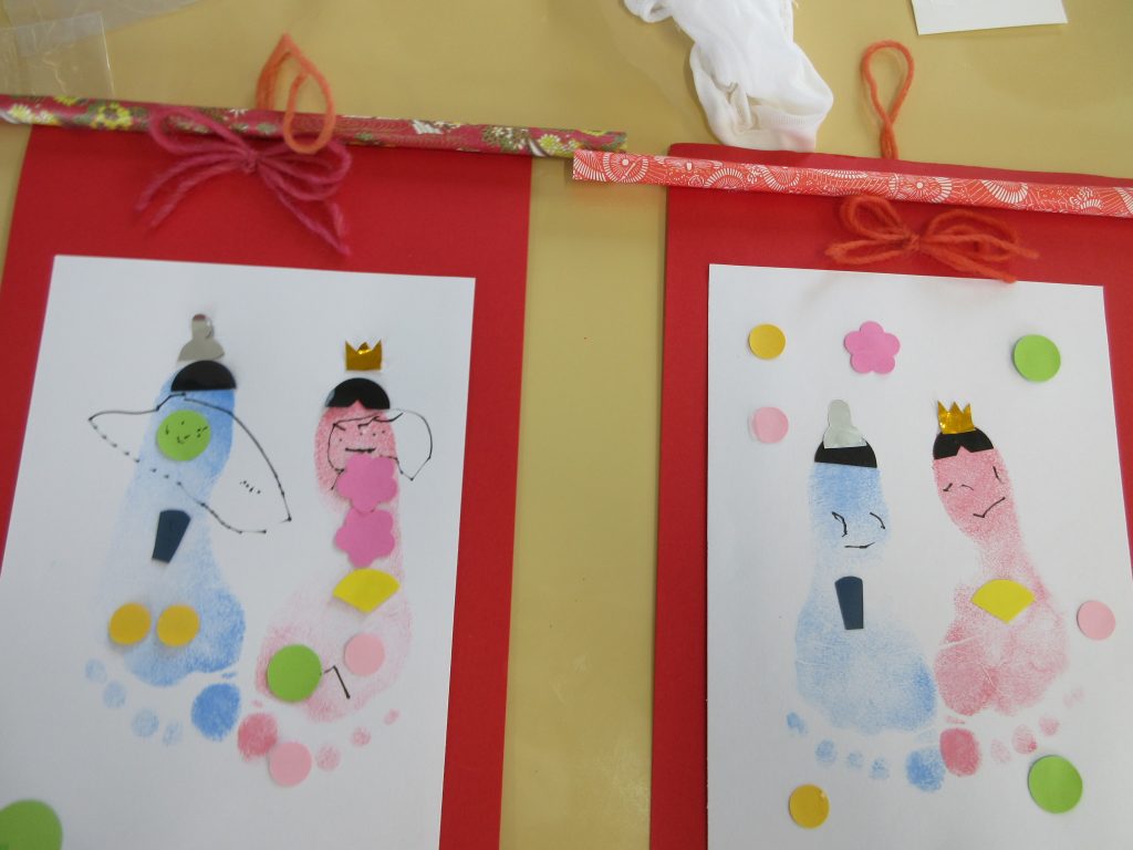 りす組2歳児親子製作:足型で雛飾り出来ました。👣アイディアが面白いですね(^_-)-☆