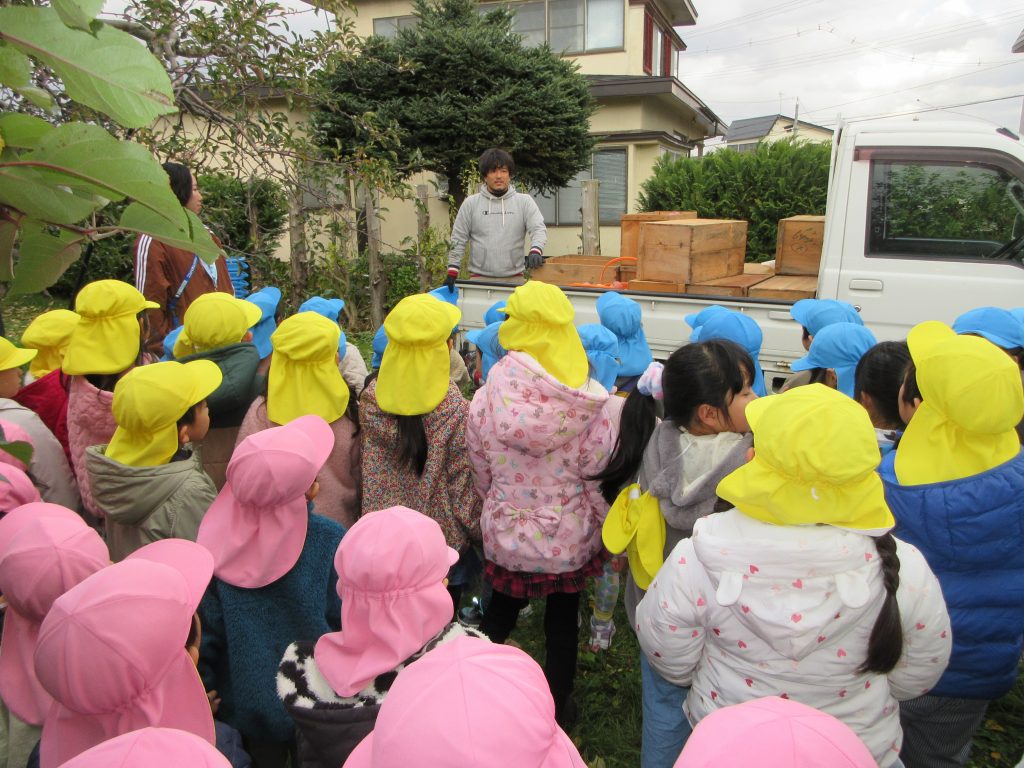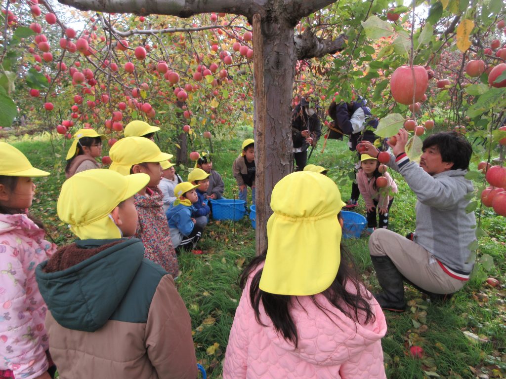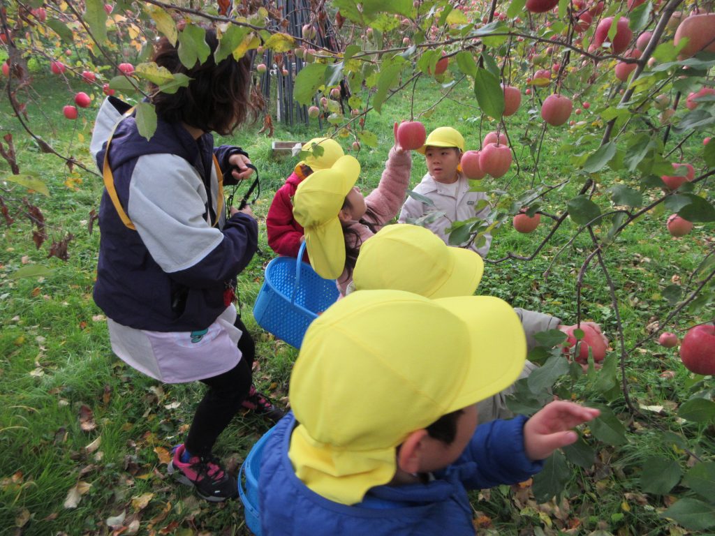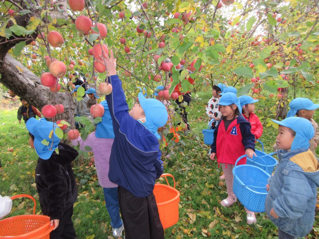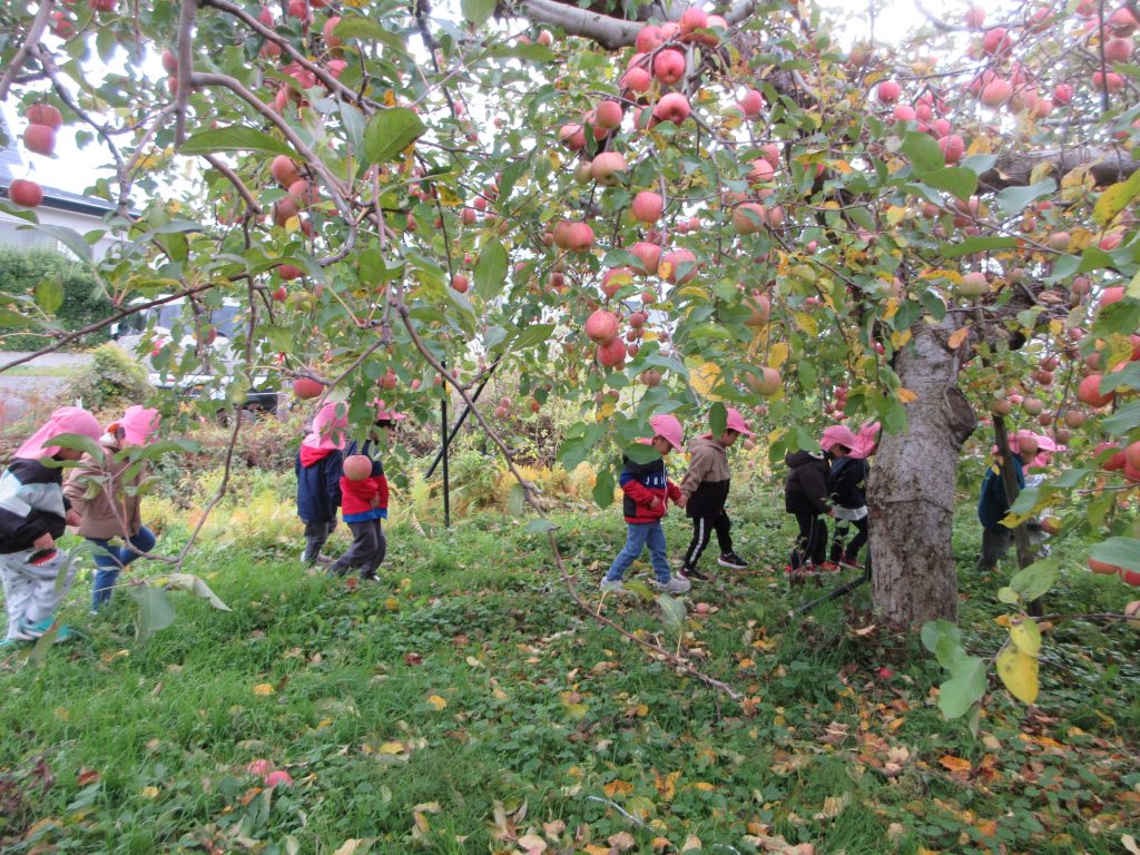 父母会の会長さんに、収穫の仕方を教えてもらい、上手に収穫体験出来ました。今日りんご🍎を持たせたので、お家にあるりんごと食べくらべてみて下さい。
